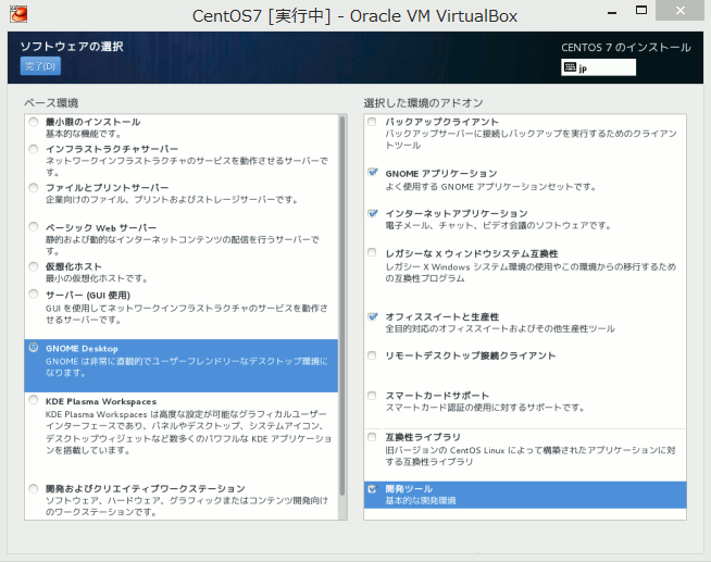 - この資料ではGNOME Desktopを選択し必要と思われるソフトウェアを選択しました。