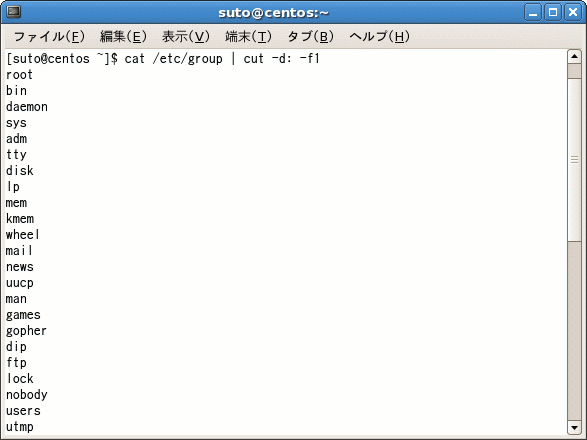 /etc/groupは以下のような構造になっています。 したがって、行先頭から:までの文字列を取得すればグループ一覧ができあがります。