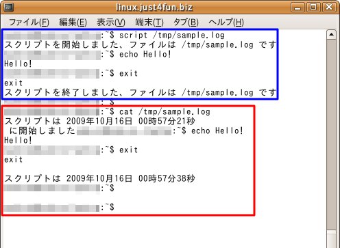 青枠はscriptコマンドの実行から終了までになり、赤枠が取得した操作ログをcatコマンドにて確認している図になります。