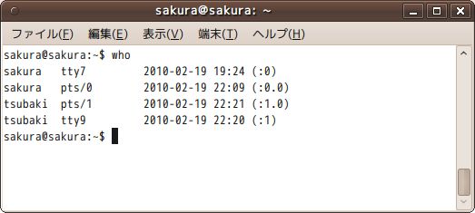 以下のスクリーンショットがwhoコマンドを実行したときのスクリーンショットです。 sakuraとtsubakiがログインしているのがわかります。