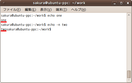 echoコマンドの-nオプションなし、ありで実行してみます。