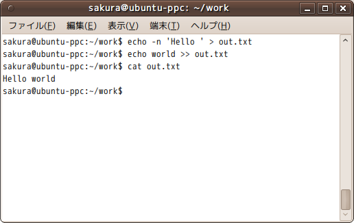 echo -n 'Hello ' > out.txt echo world >> out.txt