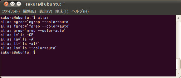 ubuntuでaliasコマンドを実行すると以下のように出力されます。