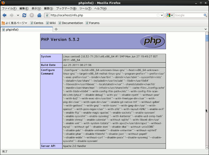 上記のコマンド(手順)でインストールしたあと、httpdを起動しphpinfo()関数を実行した時のスクリーンショットです。
