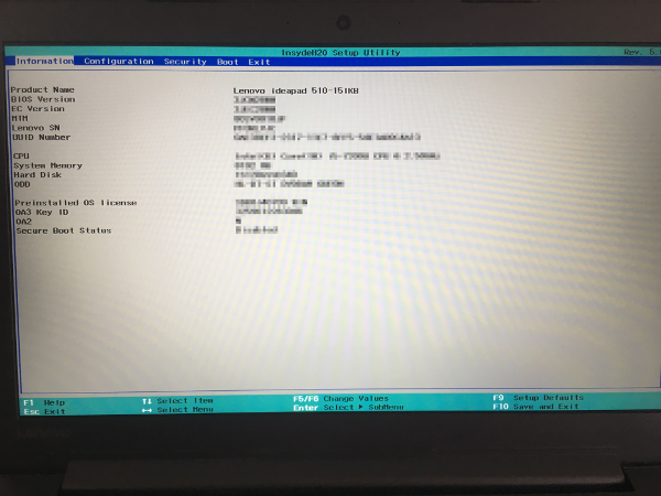 上記コマンドを実行すると再起動され、UEFI(BIOS)画面が表示されます。