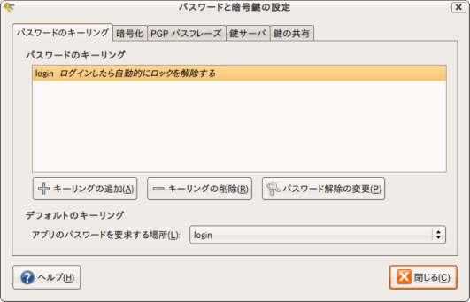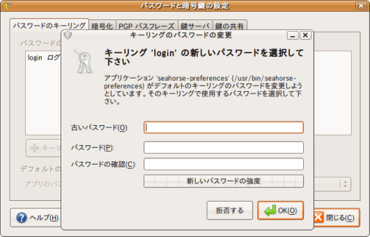 しかし、ログインの度問い合わせされるのは面倒なので、キーリングのパスワード変更方法を以下に記します。