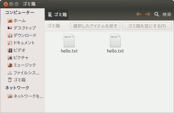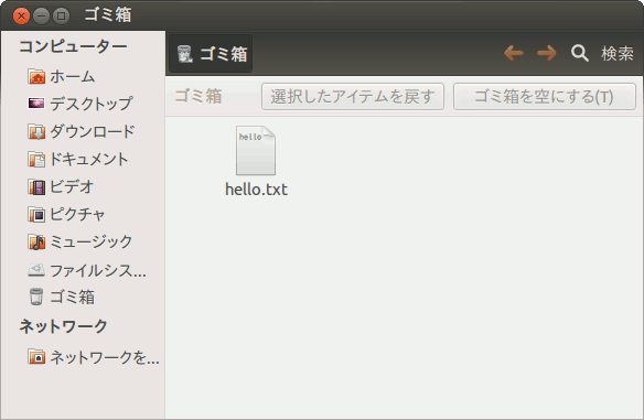 sakura@ubuntu1204:~$ echo "hello" > hello.txt sakura@ubuntu1204:~$ trash-put hello.txt sakura@ubuntu1204:~$ ls hello.txt ls: hello.txt にアクセスできません: そのようなファイルやディレクトリはありません