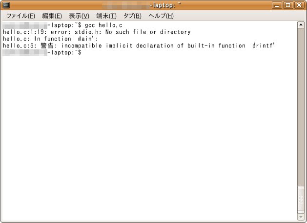 $ gcc hello.c hello.c:1:19: error: stdio.h: No such file or directory hello.c: In function ‘main’: hello.c:5: 警告: incompatible implicit declaration of built-in function ‘printf’