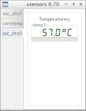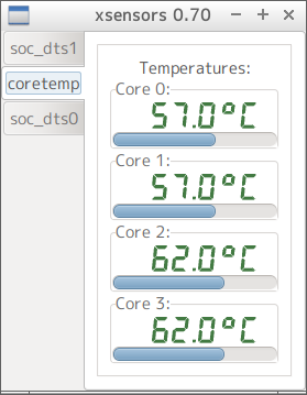 $ sensors soc_dts1-virtual-0 Adapter: Virtual device temp1: +58.0°C coretemp-isa-0000 Adapter: ISA adapter Core 0: +57.0°C (high = +90.0°C, crit = +90.0°C) Core 1: +57.0°C (high = +90.0°C, crit = +90.0°C) Core 2: +62.0°C (high = +90.0°C, crit = +90.0°C) Core 3: +62.0°C (high = +90.0°C, crit = +90.0°C) soc_dts0-virtual-0 Adapter: Virtual device temp1: +58.0°C