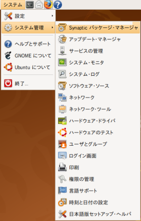 [システム]→[システム管理]→[Synaptic パッケージ・マネージャー]を選択し起動します。