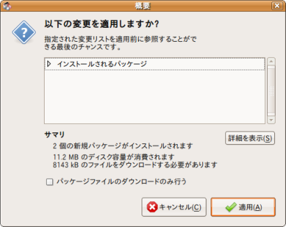 インストール前の確認画面が表示されるので「適用(A)」ボタンを押します。