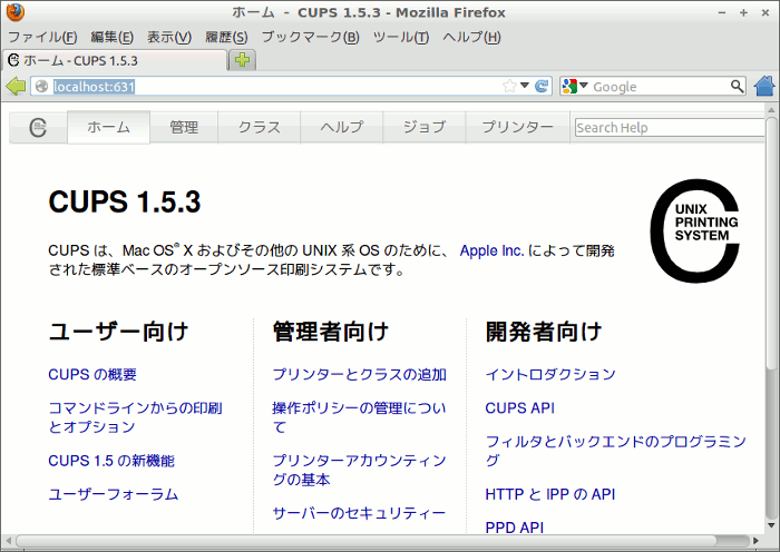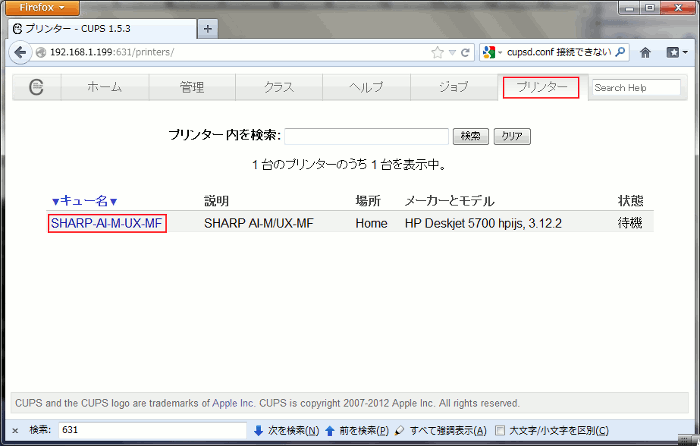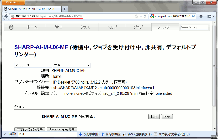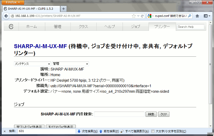 ブラウザからプリントサーバ(CUPS)の状態を確認することができます。