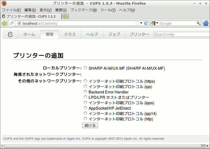尚、CUPSがインストールされていない場合は、インストールしてください。