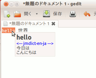 以下のスクリーンショットを見てもらうと、gedit上の単語をマウスで選択すると、和訳、英訳が表示されます。