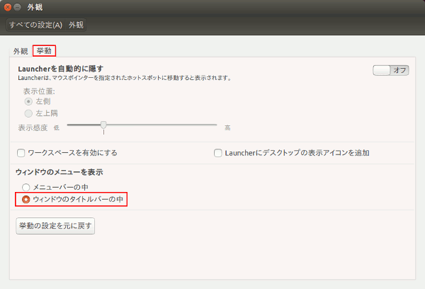 しかし、Ubuntu14.04から設定によりウインドウ上部にメニューを表示することができるようになりました。