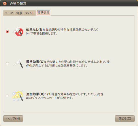 視覚効果を有効にするとキー入力の反応などとても遅くなったため、結局は視覚効果をオフ(効果なし)にしました。