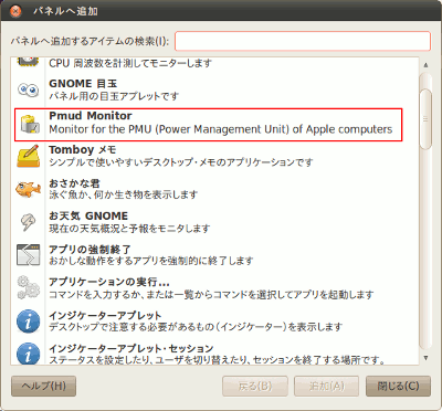 gpmudmon-appletをインストールしても一覧に表示されない場合は、ログアウトや再起動をして再度操作を行ってください。