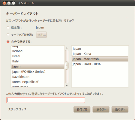 今回のインストールマシンはiBook G4なので以下のようにキーボードの設定をJapan - Macintoshにしました。