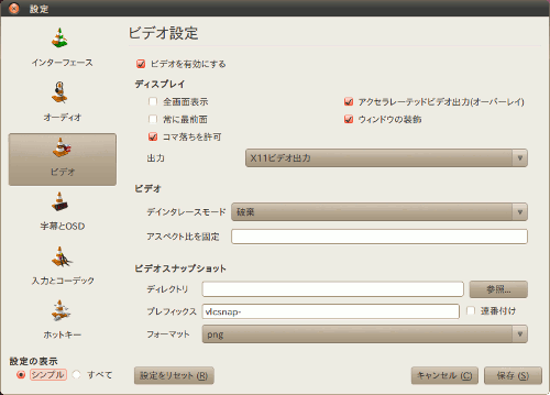 下図の画面が表示されるので「ビデオ」をクリックし出力を「X11ビデオ出力」に変更し保存しました。