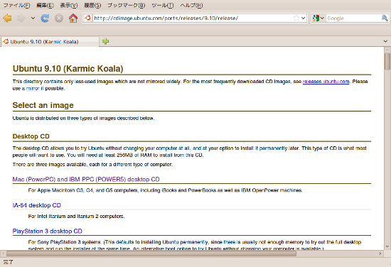 今回はubuntu9.10なので「9.10 Karmic Koala」になります。
