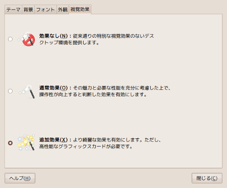 操作方法は、「システム」→「設定」→「外観の設定」を起動すると以下の画面が表示されるので「視覚効果」タブの「追加効果(X)」を有効にします。